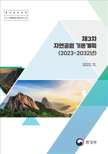 제3차 자연공원 기본계획(2023~2032년)은 자연공원법상 '자연공원 기본원칙('20.6.9.)'을 기반으로 기본방향을 설정하였다. '자연과 사람이 함께하는 미래, 자연공원'을 비전으로 5가지 추진전략을 제시하였다. |