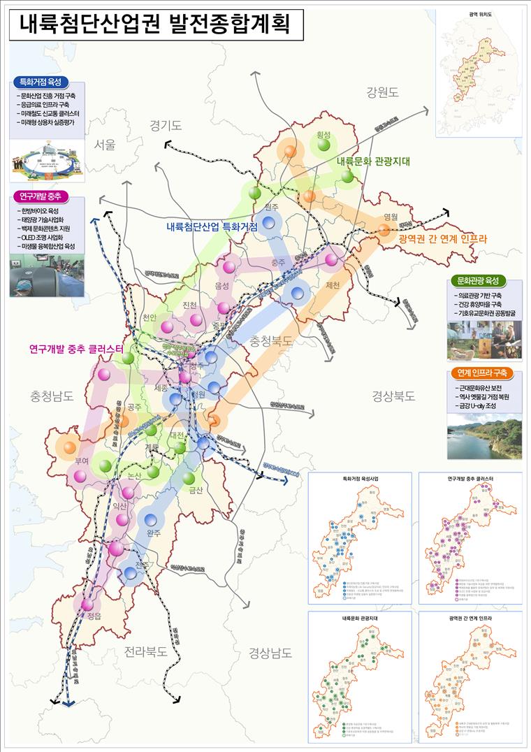 이번 내륙첨단산업권 발전종합계획을 주관한 충청북도는 민선 5기 들어 역점적으로 추진하고 있는 ‘생명과 태양의 땅 충북 건설’을 실현하기 위해 ▴한약재 집하 및 유통센터 건립 등 의약·한방바이오 산업 기반 구축, ▴태양전지종합기술지원센터 건립 등 태양광 기술사업화 연계협력사업을 계획에 포함하였으며, KTX 오송역 개통과 철도종합시험선로 구축으로 충북이 철도산업의 중심지로 부상함에 따라 ▴미래철도․신교통 시스템센터 구축 등 미래철도·신교통 인프라 구축을, 지역의 첨단의료 기능과 역사·문화자원을 토대로 ▴충북 건강․휴양마을 등 내륙문화 관광지대 조성을 중점 추진하는 것으로 계획을 수립하였다.